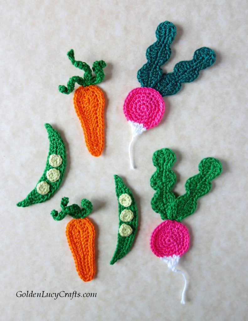 Free Crochet Pattern for Crochet Radish, Carrot and Pea Appliques