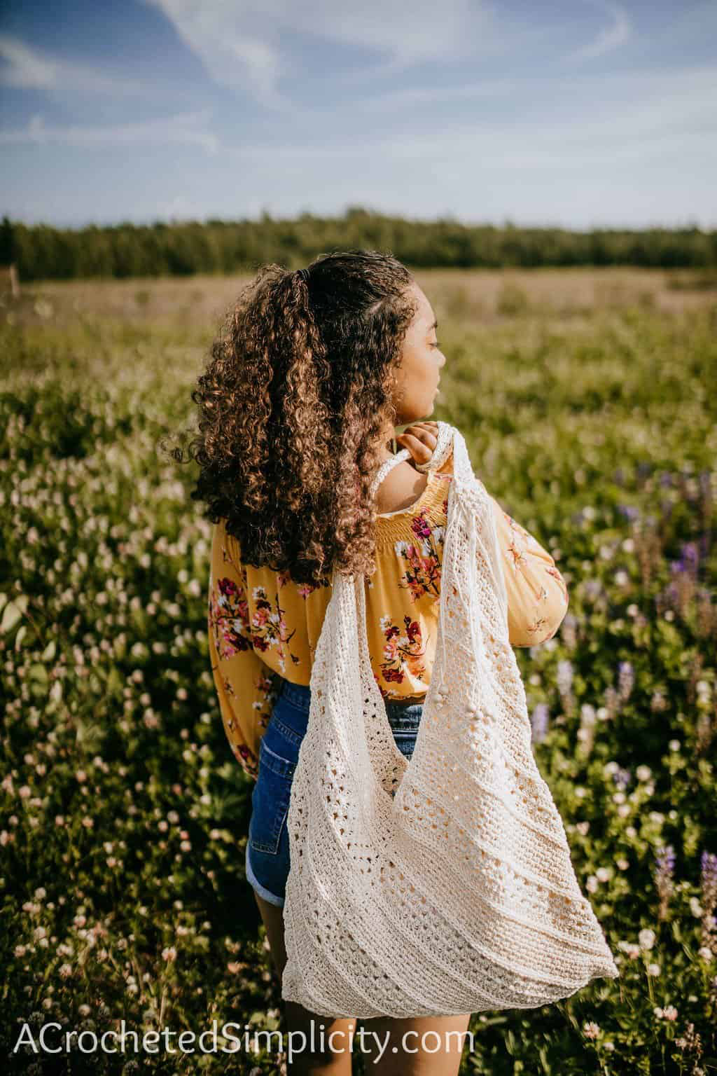 On The Bias Tote Bag (A Crocheted Simplicity): Made with simple stitches, this tote gets a playful, boho flair from a simple macramé detail and wooden beads on the strap. Get the free pattern here.