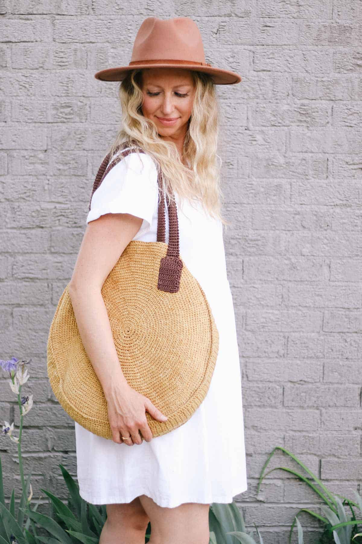 Easy Round Crochet Tote Bag (Make and Do Crew): This minimalist, raffia-style round bag is simple, stylish, and the perfect match for any summer outfit. Get the pattern here.