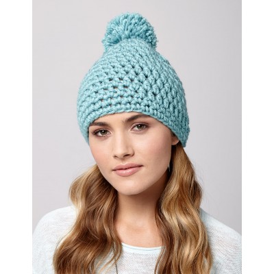 A classic pompom beanie, in a cool blue perfect for cold days! A great beginner project, the hat is crocheted in Bernat Softee Chunky yarn.