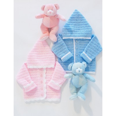 What darling hoodies, perfect for keeping that precious little guy or girl warm and snug. Sizes 6 to 24 months. Crochet in Bernat Baby Coordinates Soft Blue, Baby Pink, and White on size 4 mm (U.S. G or 6) crochet hook.