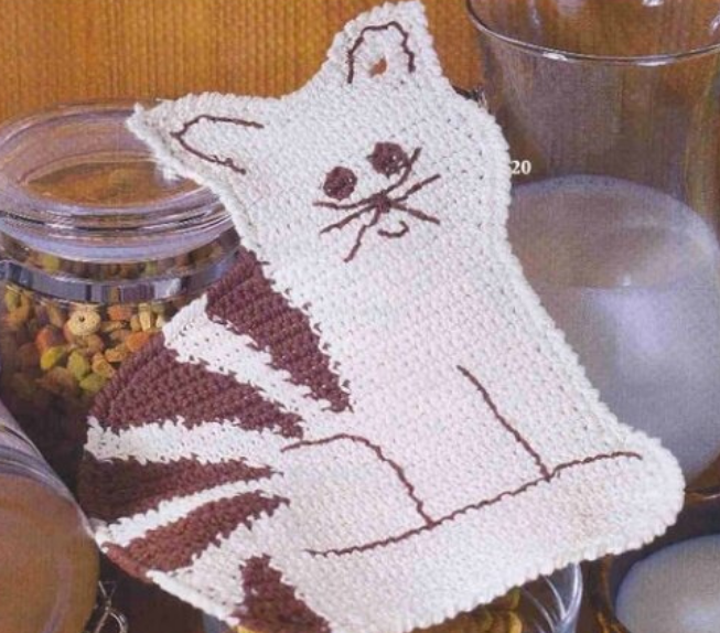 Charming Cat Potholder Knitting Pattern. Crochet a delightful and functional cat-shaped potholder with this easy-to-follow pattern. Perfect for adding a touch of whimsy to your kitchen or as a thoughtful handmade gift for cat lovers. This pattern features clear instructions for creating a tabby cat design using natural and brown yarn.