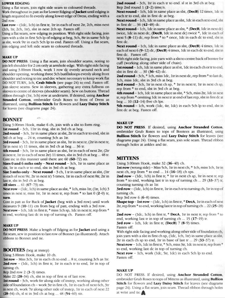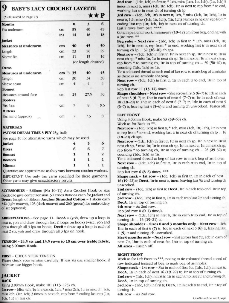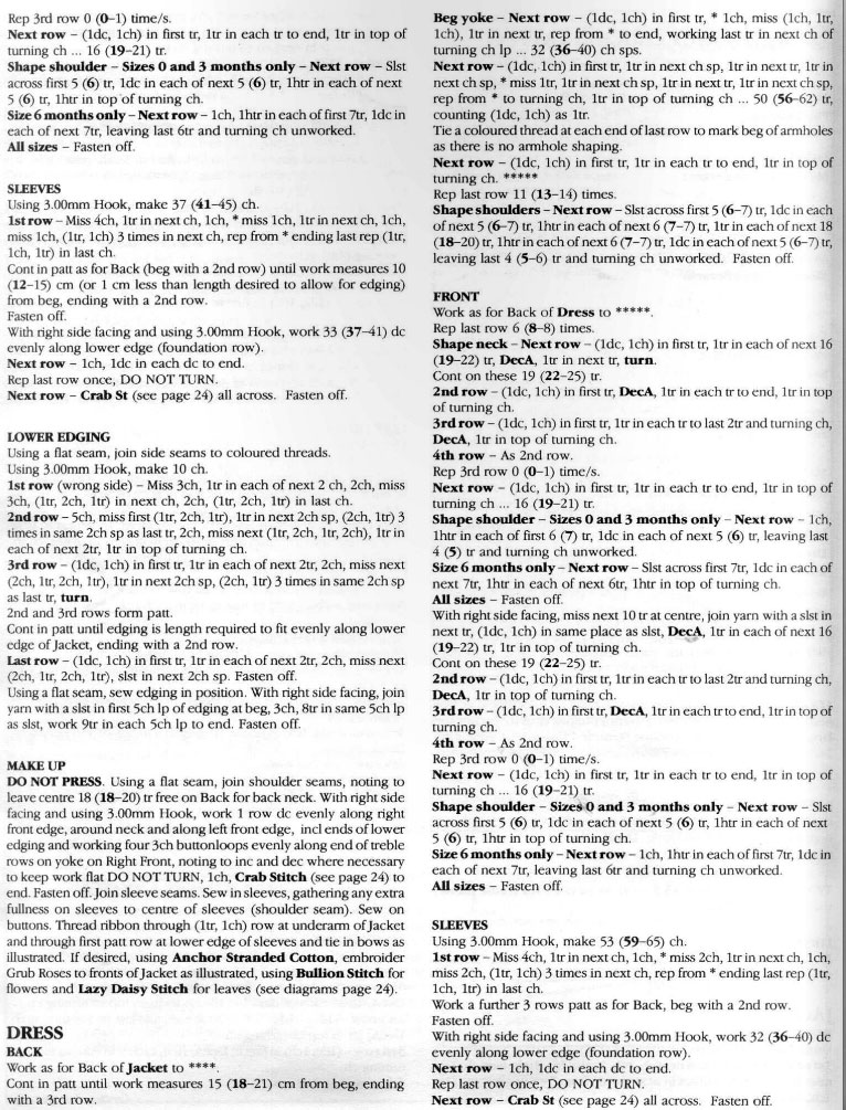 Crochet baby pattern for jacket, dress, bonnet, booties, mittens and lacy shawl.