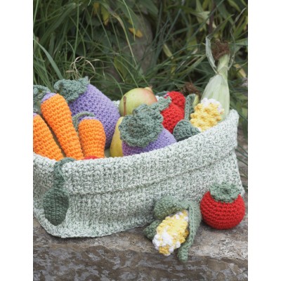 Free crochet pattern for tomatoes, carrots, corn cob, eggplants and radish.