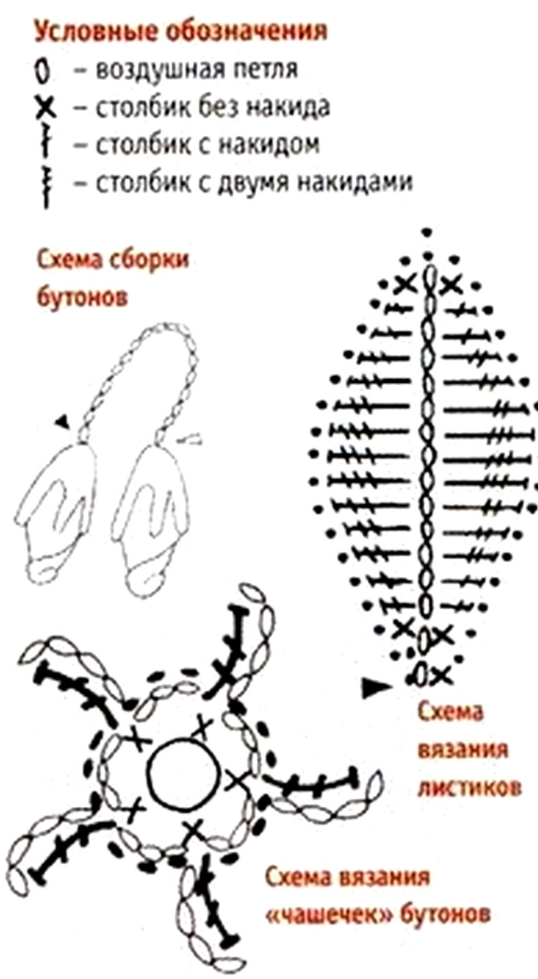 Вязать по прилагаемым схемам (схемы цветка и листа).