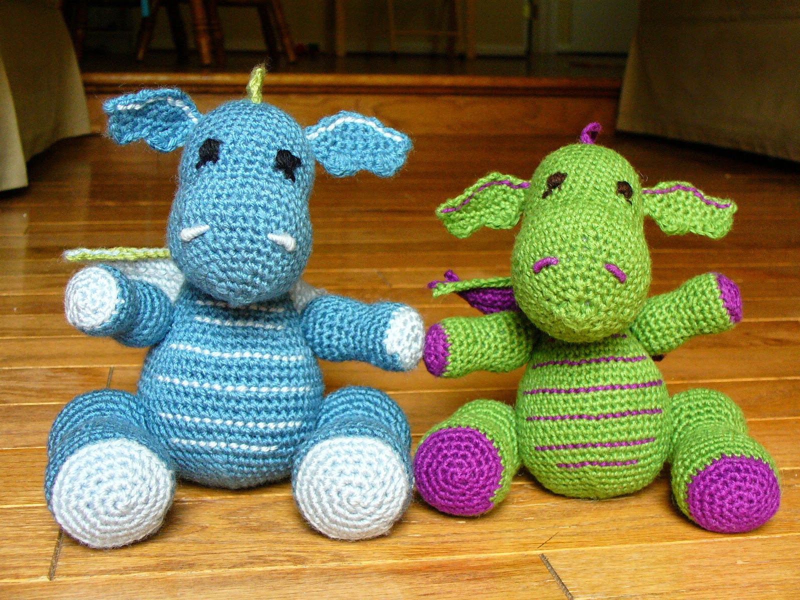 I made these two with two different types of yarn. The larger blue one is made with worsted weight acrylic yarn and the smaller green one is made with a DK weight yarn that I have been wanting to try called CotLin from Knit Picks. I really enjoyed working with it. It is 70% Tanguis Cotton and 30% Linen. It is softer than 100% cotton and not prone to splitting. But back to dragons.
