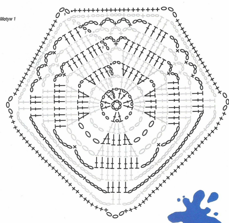 Tejer 33 × motivo 1, 4 × motivo 3, 2 × motivo 2, 2 × motivo 4 y 1 × motivo 5 (ver esquemas).