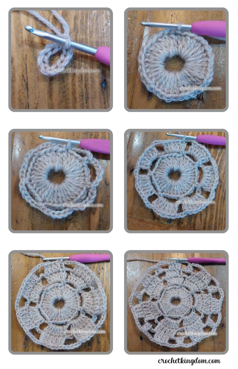 Round 4: chain 3 (counts as 1st dc), 5 dc into the chain space below, { chain 3, 6 dc into the next chain space from the round below} 6 more times, chain 3 and slip stitch closed