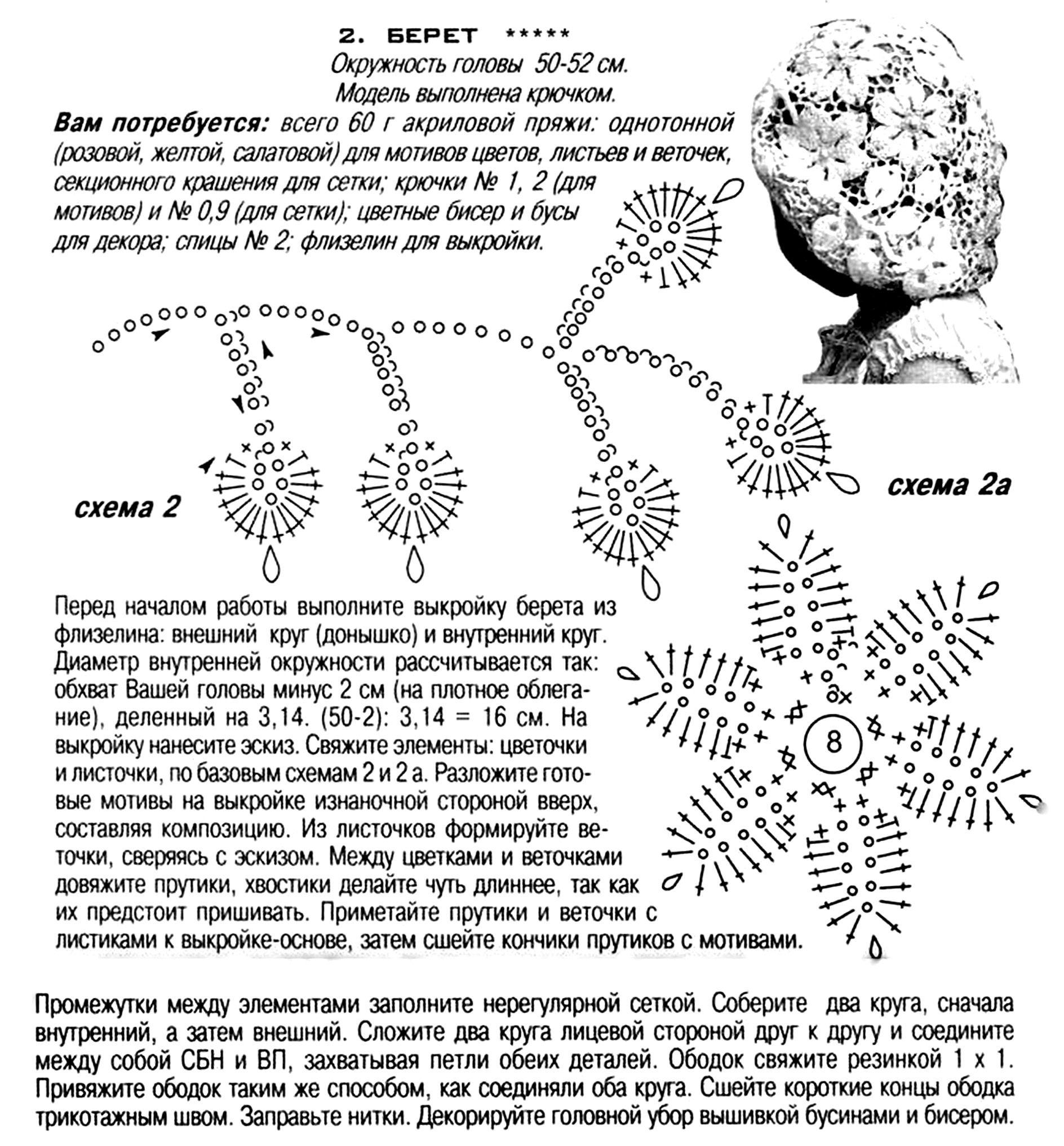 Нежный декоративный берет, связанный крючком, сочетает в себе цветочные мотивы, листовые веточки и лёгкую сетчатую основу. Украшен вышивкой с бисером и маленькими бусинами, этот аксессуар лёгкий, элегантный и выразительный — идеально подходит для весны и лета.