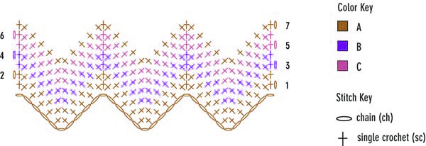 Row 1 Work 2 Sc in 2nd ch from hook, *1 sc in next 3 ch, skip 1 ch, 1 sc in next ch, skip 1 ch, 1 sc in next 3 ch, 3 sc in next ch; rep from * to last 10 ch, 1 sc in next 3 ch, skip 1 ch, 1 sc in next ch, skip 1 ch, 1 sc in next 3 ch, 2 sc in last ch. Turn.
