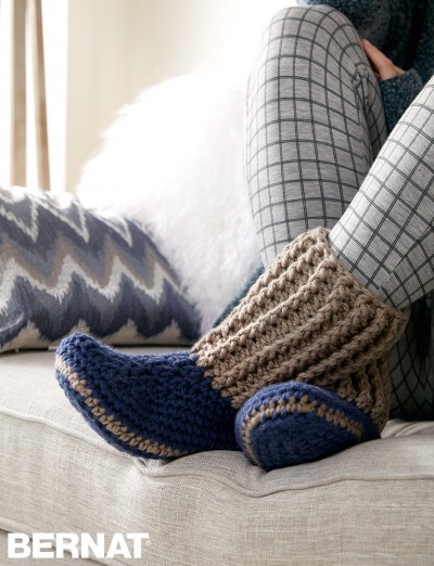 Nothing beats a pair of warm, snuggly slipper socks! This intermediate pattern is crocheted in Bernat Softee Chunky yarn.