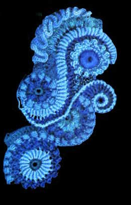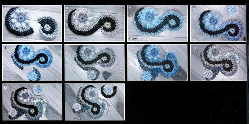 - Crochet two round motifs and edge them with horseshoe-shaped elements, forming curves by working two stitches into one base stitch. (7)