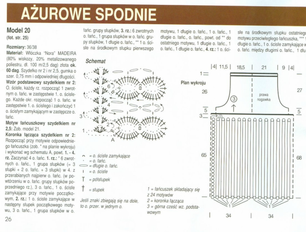 These crochet pants are worked with a delicate gold viscose-metallic blend yarn. The design combines intricate chain motifs, connecting lace, and a structured base pattern, giving a sophisticated and slightly textured finish. The pants feature a flexible waistband with an inserted elastic and are designed to fit sizes 36/38. Perfect for a unique statement piece or as part of a stylish handmade wardrobe.