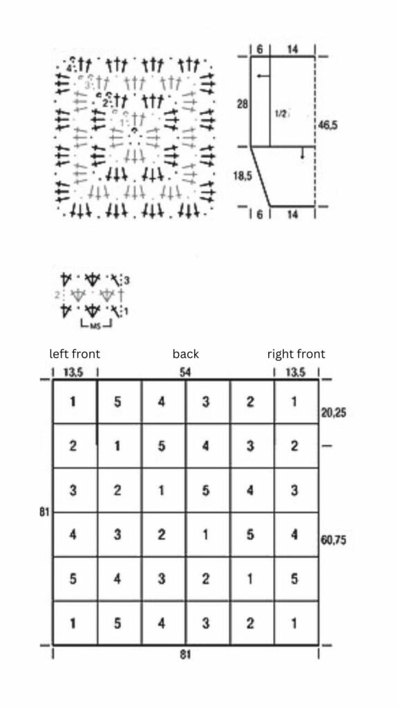 • Cardigan is worked from granny squares. Back and fronts are crocheted in one piece until armholes, then separated.
