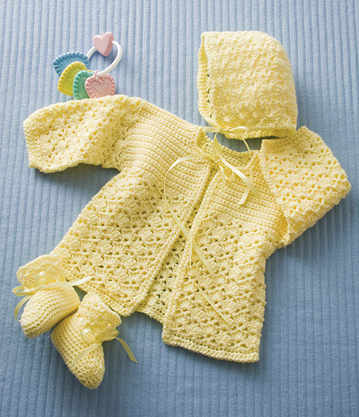 Size for infants 3-6 months, this pretty outfit is stitched using light worsted-weight yarn and accented with pretty ribbon ties.