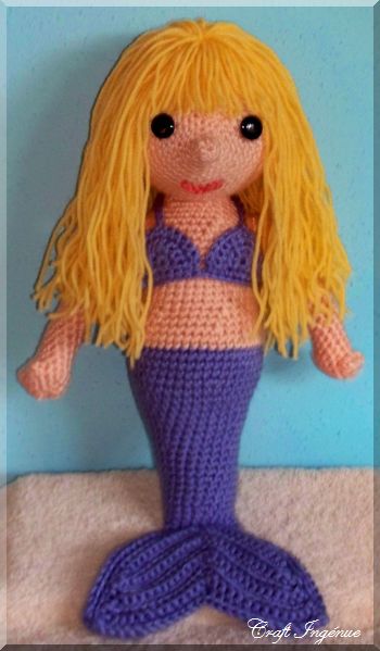 “When crocheted with yarns and hooks specified, mermaid measures 16 ½ inches L and