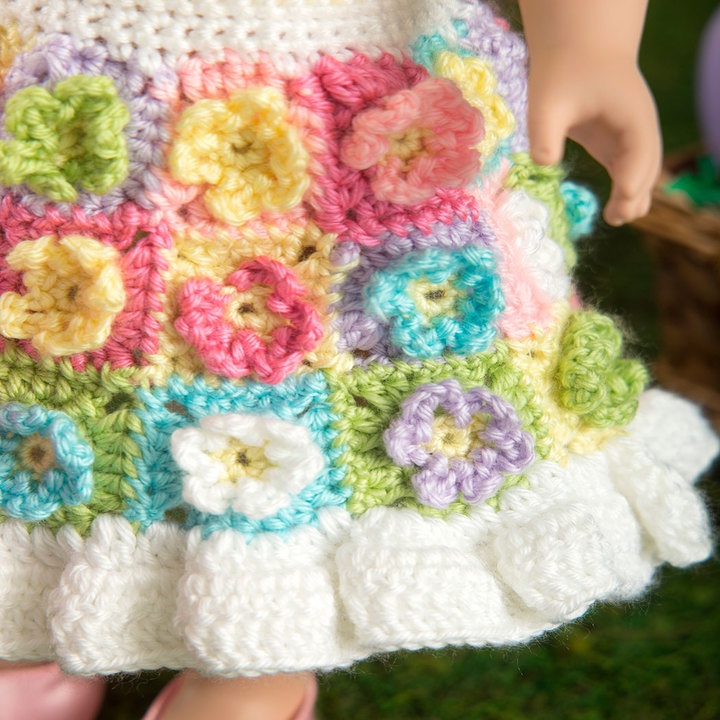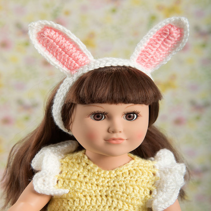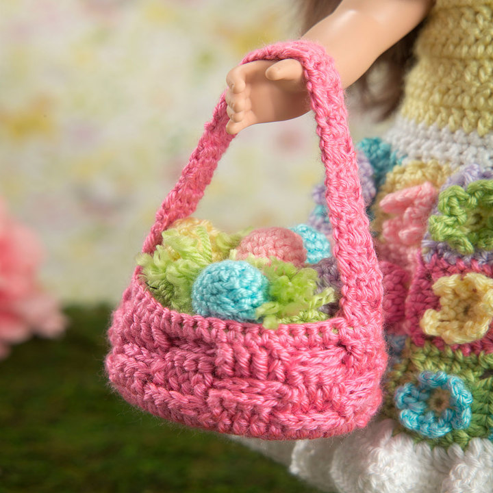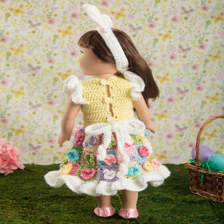 Create the perfect outfit for her 18” doll to wear in the Easter parade. This sweet ensemble includes dress with pretty flower skirt, a headband with bunny ears and an Easter basket filled with colorful eggs.