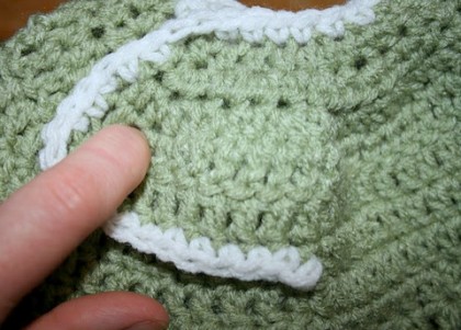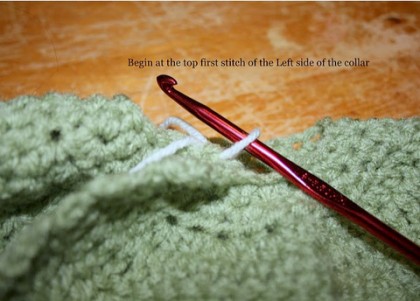 Now, use a contrasting or complimenting color of your choice (same yarn weight), and SC around the collar and dress bottom perimeter (as shown.)