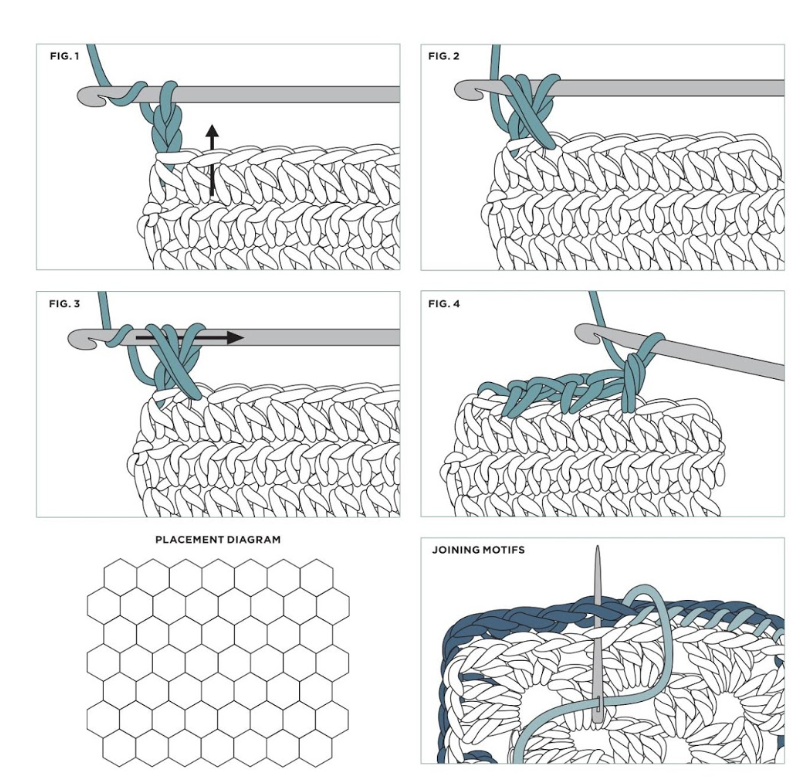 With wrong sides together, and working through inside loops, whipstitch Motifs together. forming four vertical strips of seven Motifs each and three vertical strips of eight Motifs each; then whipstitch strips together in same manner following Placement Diagram.