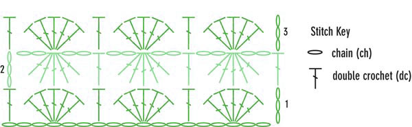 Row 1 (WS) 5 dc in 6th ch from hook, skip 2 ch, 1 dc in next ch, *skip 2 ch, 5 dc in next ch, skip 2 ch, 1 dc in next ch; rep from * to end. Turn.