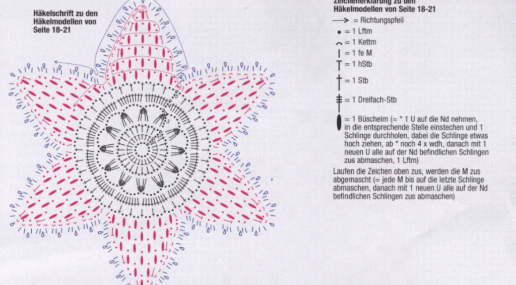 - In Round 6 (marked pink in the diagram), crochet the individual star points back and forth, following the direction arrows.