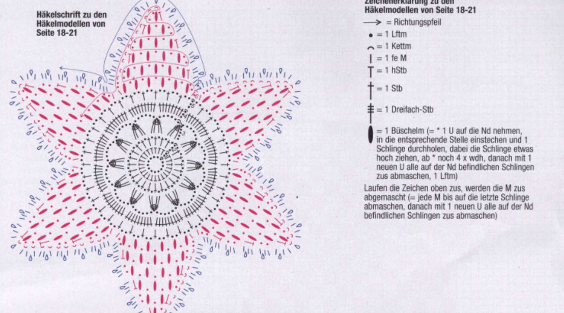 - = 1 Büschel (= * 1 U auf die Nd nehmen, in die entsprechende Stelle einstechen und 1 Schlinge durchholen, dabei die Schlinge etwas hoch ziehen, ab * noch 4 x wdh, danach mit 1 neuen U alle auf der Nd befindlichen Schlingen zus abmaschen, 1 Lftm)