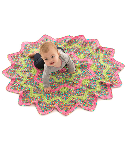 Crochet this colorful blanket for a baby that brings a burst of sunshine into your life! Start at the center and work your way out to the 16 points. There’s no seaming in this delightful design.