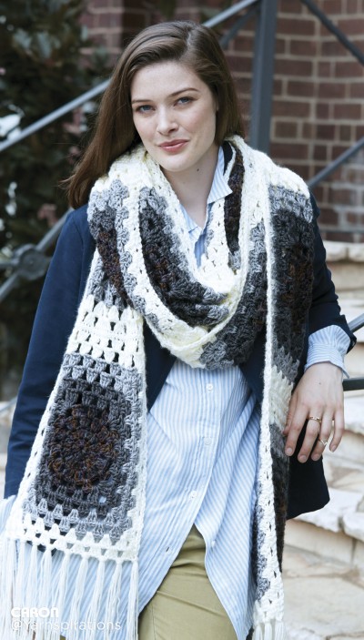 Super Granny to the rescue! These oversized granny squares are perfect to customize. Choose your color adventure and whip up this crocheted Super Scarf in Caron Simply Soft.
