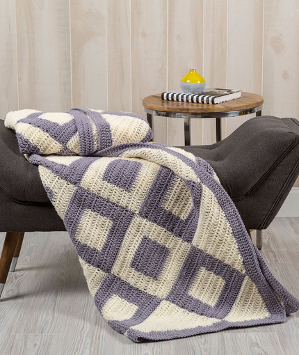 Positive-negative crochet square motifs in just two colors are sewn together in diagonal strips for this striking throw. Side and corner triangles fill in the edges and then a simple border is the perfect finish.
